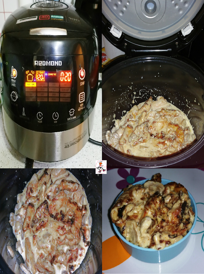 Salpimentamos la pechuga de pollo que tendremos troceada previamente. Añadimos el sobre de sopa de cebolla y mezclamos bien. Programamos la Multicooker en MULTI COOK 20min. Añadimos un chorrito de aceite en el cuenco de la olla y freímos las pechugas de pollo, cuando empiecen a dorar añadimos los champiñones y sofreímos. Añadimos la nata (crema de leche), mezclamos bien y dejamos que termine el programa con la tapa cerrada.