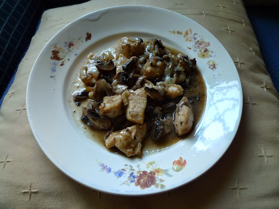Las insulsas pechugas de pollo, se pueden realzar si las guisamos acompañadas de cebolla y unos champiñones (o setas). De esta forma resulta mucho mas agradable comerlas y no se incrementan mucho las calorías iniciales.