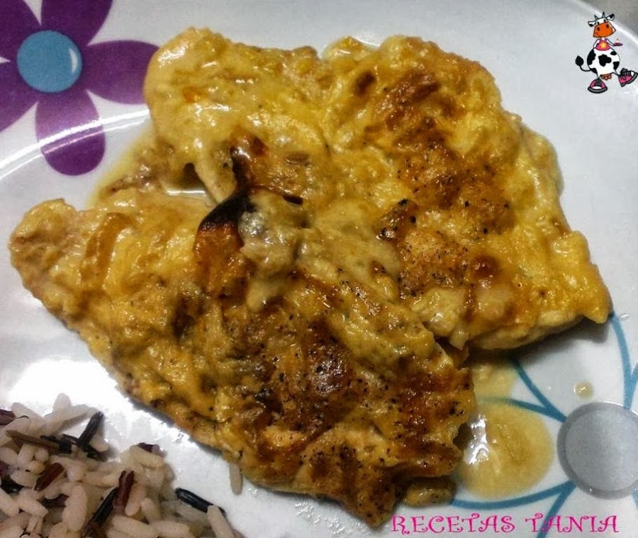 Salpimentamos los trozos de la pechuga de pollo y los embadurnamos con la sopa de cebolla. En una fuente de cristal ponemos un fondo de la leche evaporada y encima los trozos de pechuga embadurnados con la sopa de cebolla,añadimos el resto de la leche evaporada y lo ponemos en el horno durante 20-25min a 220º aprox.