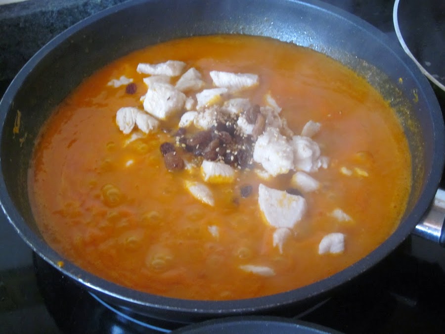 Trituramos el sofrito de pimiento y mango y añadimos en esa salsa los trozos de pollo rehogados,cocemos como 20 minutos o hasta que veamos el pollo tierno, el los últimos minutos añadimos las pasas y el sésamo,probamos y rectificamos de sal.