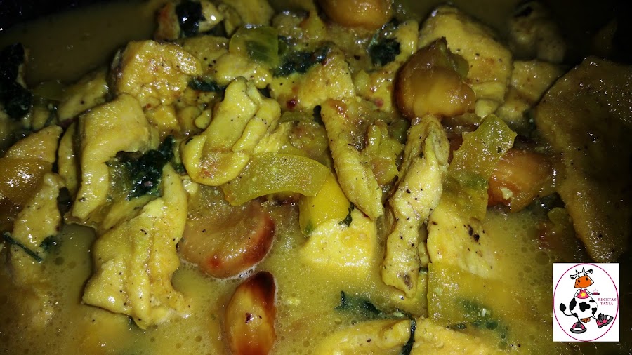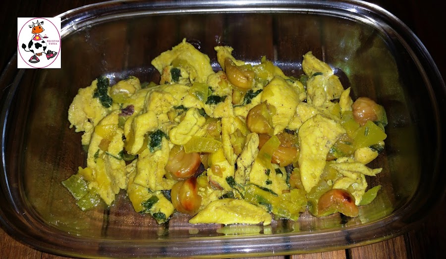 Empezamos troceando la pechuga de pollo en tiras y reservamos. Picamos el perejil y troceamos la cebolla. Las castañas yo las tenia asadas ya, las pelamos y reservamos.