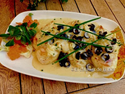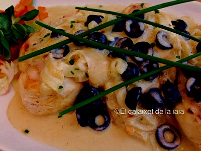 y emplatamos colocando las pechugas y sobre las mismas, la salsa, las aceitunas y cebollino picado