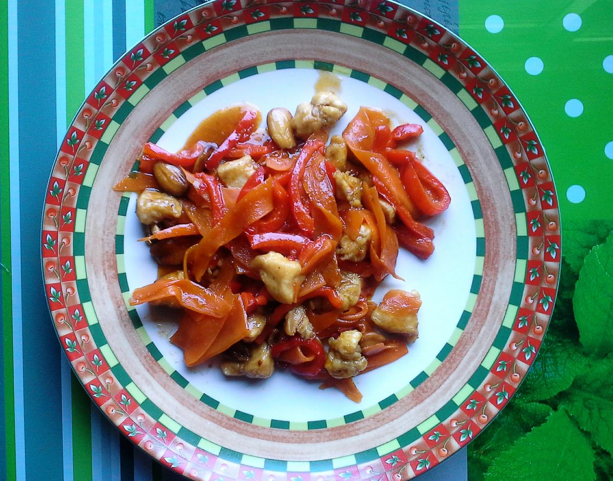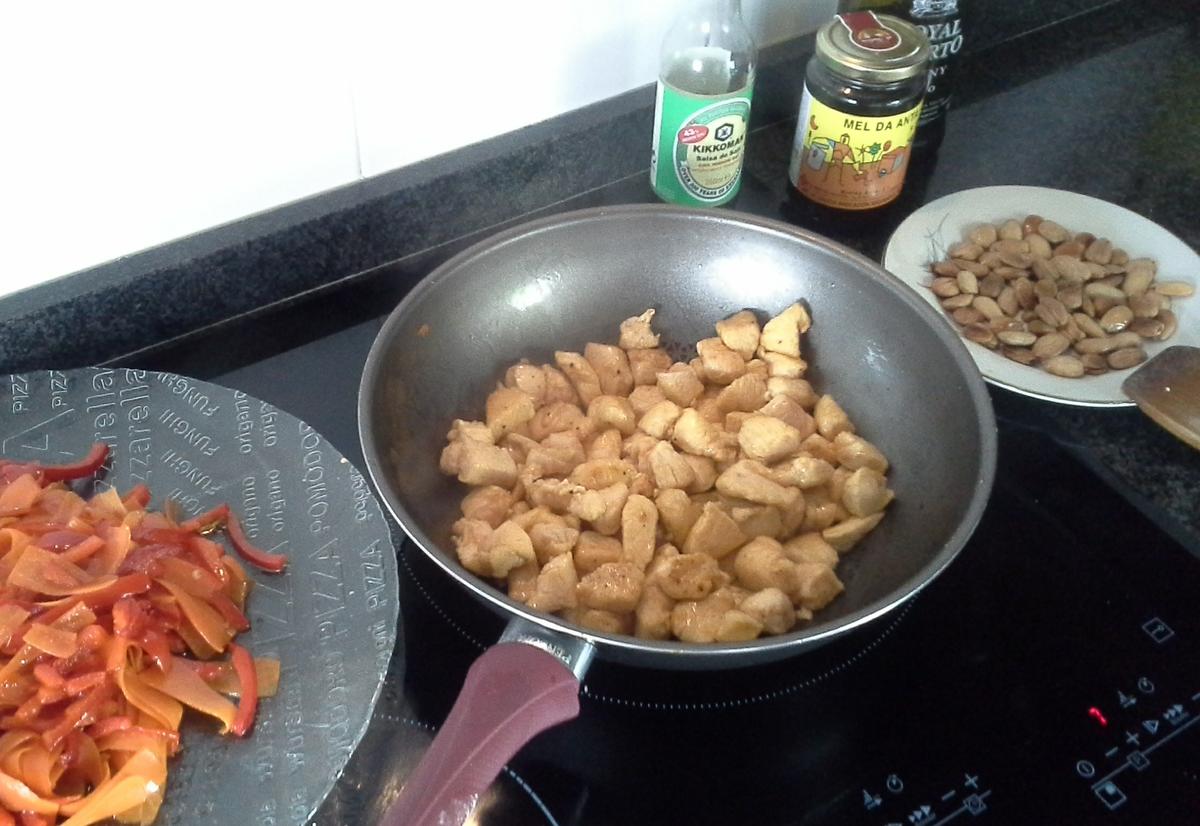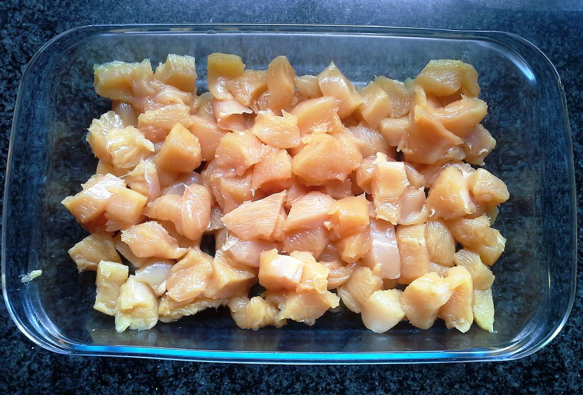 Retiramos a una fuente la verdura e incorporamos los trocitos de pollo a la sartén añadiendo un poco más de aceite si fuese necesario.
