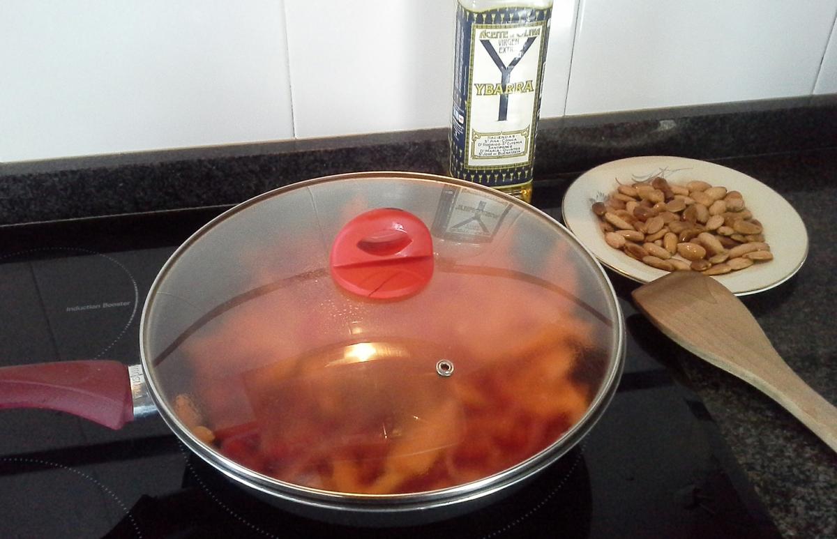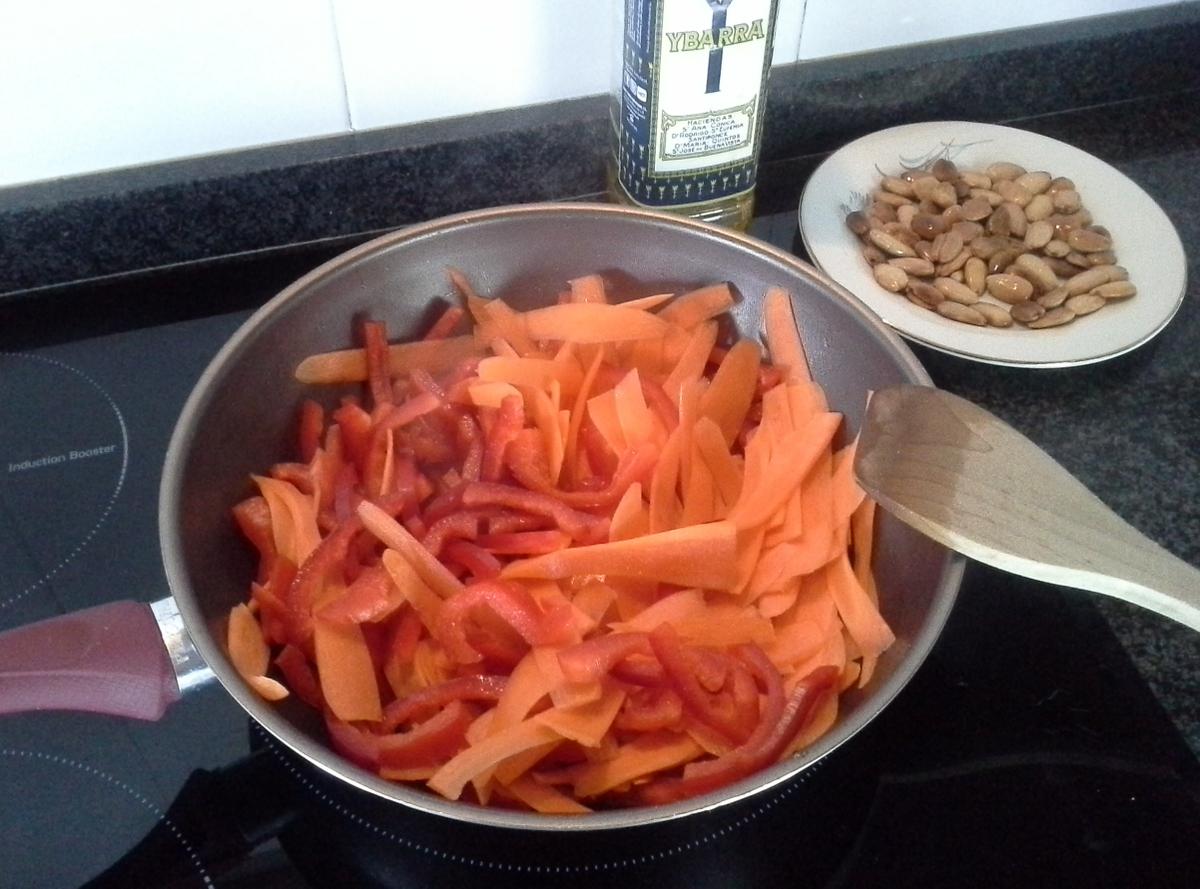 Una vez tostadas las reservamos y añadimos otro par de cucharadas de aceite para saltear las verduras. Sazonamos, removemos un par de veces y luego tapamos la sartén para que pimiento y zanahorias se vayan cociendo lentamente.