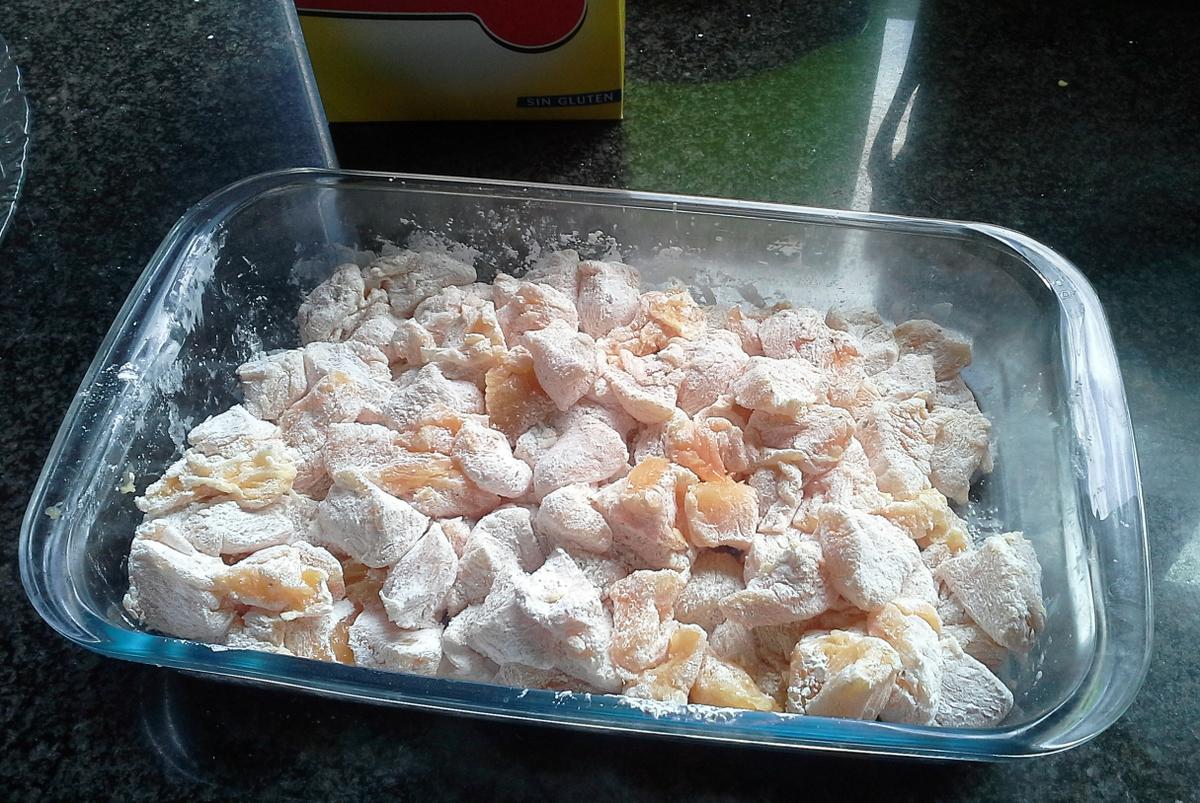 Mientras se va haciendo la verdura cortamos el pollo en trocitos pequeños, salpimentamos y rebozamos ligeramente en harina de maíz.