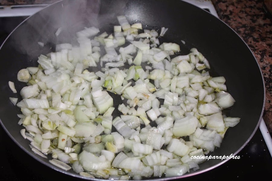 1 vaso vino blancoPicamos la cebolla y el puerro, los ponemos en una sartén con un podo se aceite y dejamos pochar.