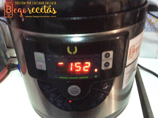 Cerramos la tapa, dejamos abierta la válvula y programamos menú confitar 150 minutos.
