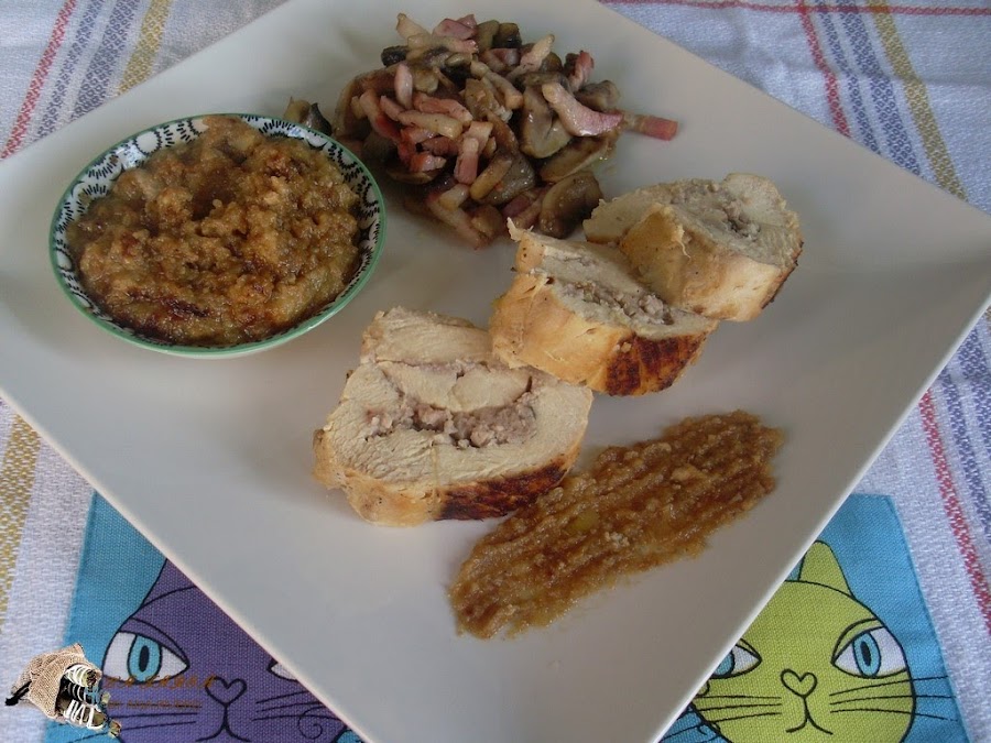 Servir la pechuga con la salta y acompañada por los champiñones y el bacon