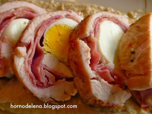 Por último ponemos los dos huevos cocidos en un extremo, uno seguido del otro y enrollamos dando vueltas por el lado más estrecho de la pechuga.