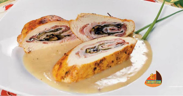 Con el líquido que suelten las pechugas colócalo en una cazuela junto con 1 vaso y medio de agua y diluye medio sobre de crema de Champiñones, lleva al fuego y cocina hasta que espese. Sirve las pechugas rellenas junto con la Salsa de champiñones.