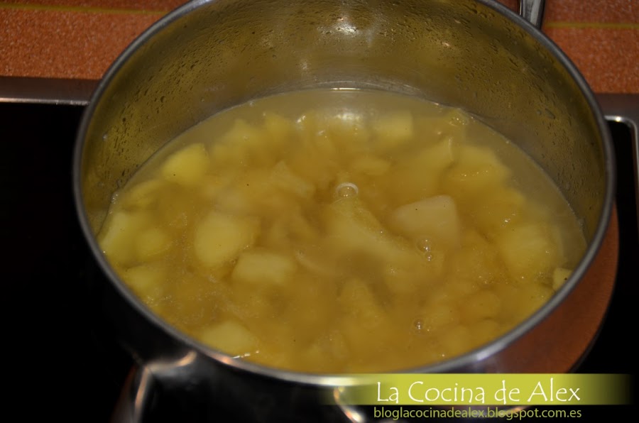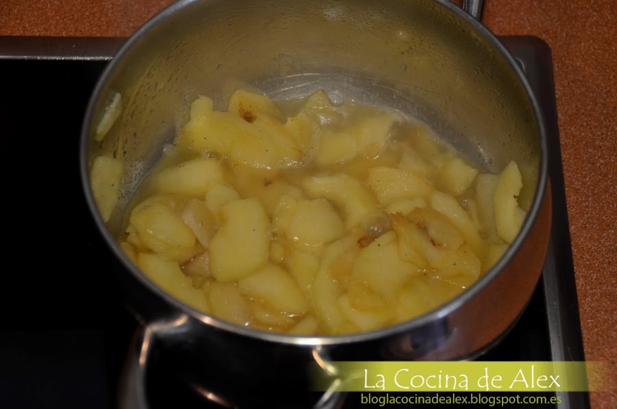 Cuando la manzana esté dorada, añadimos el vino blanco y dejamos reducir prácticamente por completo. Cubrimos de agua, ponemos sal, pimienta y dejamos cocer hasta que la manzana este casi desecha.