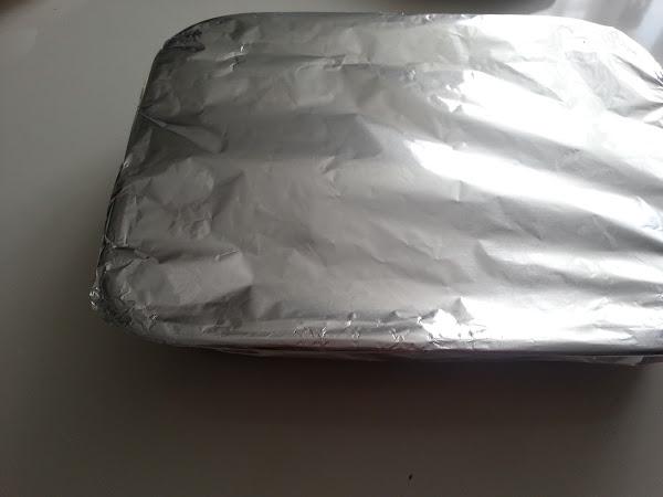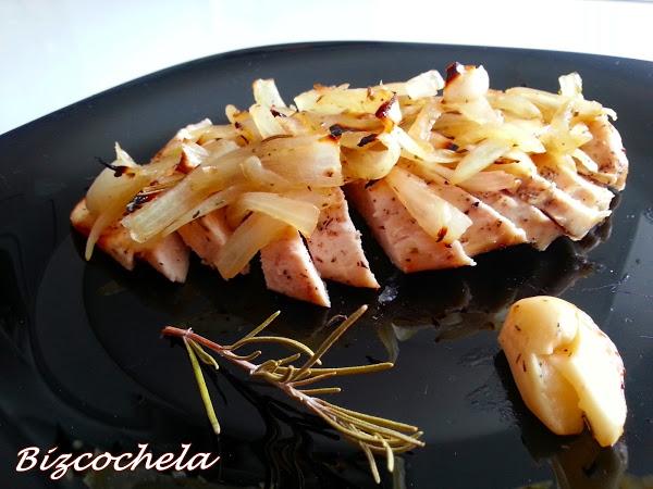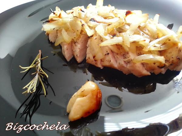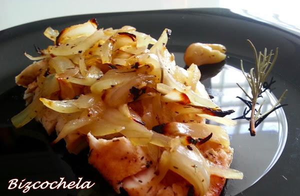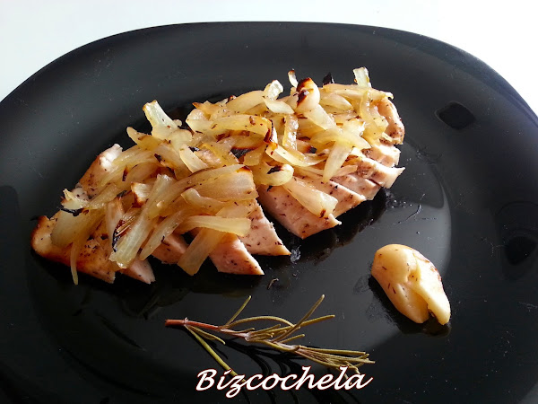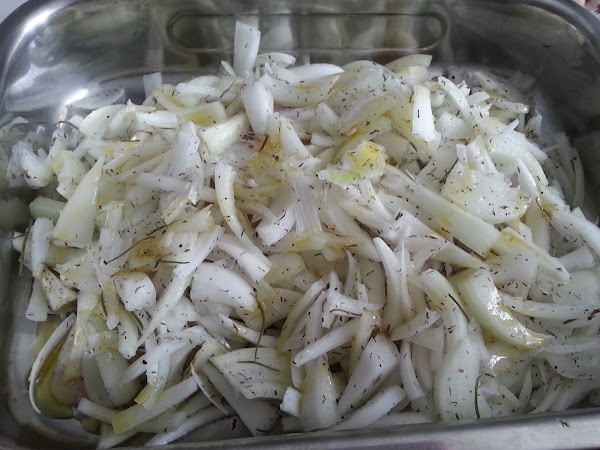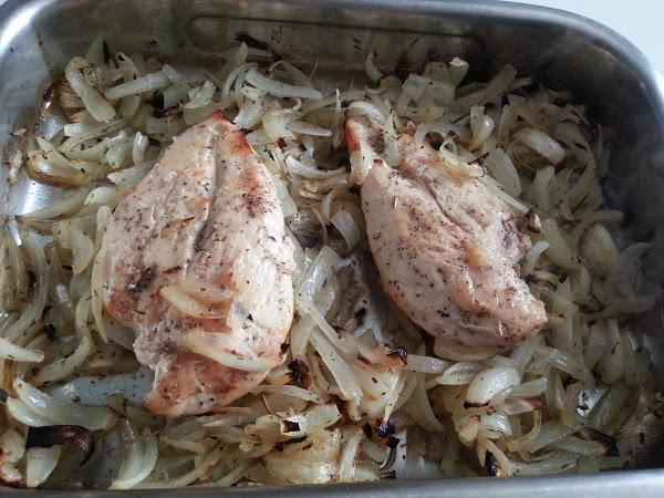 5. - Cubrimos las pechugas con la cebolla, le ponemos un poco de aceite y tapamos la fuente con papel de aluminio.