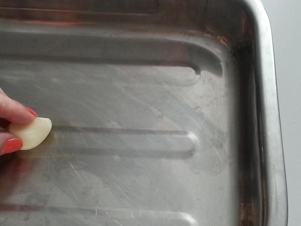 1. - Encendemos el horno a 180º. Pelamos y frotamos con los dientes de ajo una fuente de horno. Dejándolo en la fuente después.
