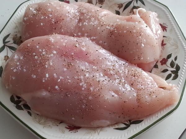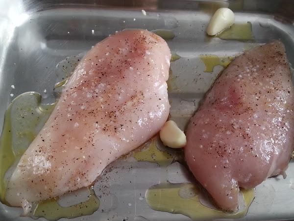 2.- Salpimentamos las pechugas con la sal, la pimienta y las colocamos en la fuente.