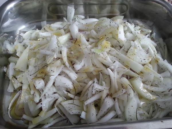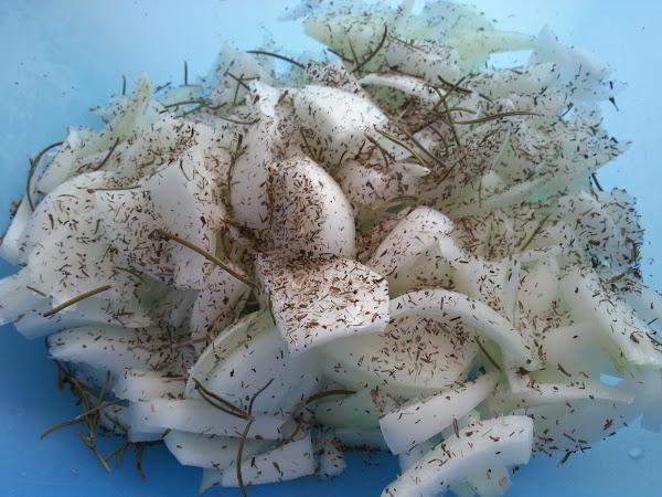 4. - Cortamos la cebolla en tiras y las ponemos en un bol, donde le echaremos una cucharadita de sal, el tomillo y el romero, y lo removemos bien.