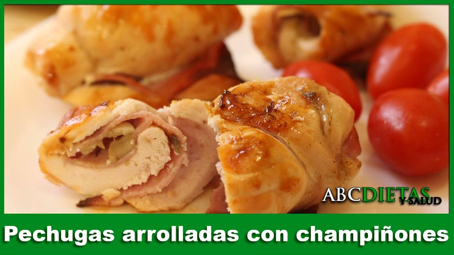 * Toma un filete de pollo, pon encima una loncha de jamón y algunos champignones fileteados.