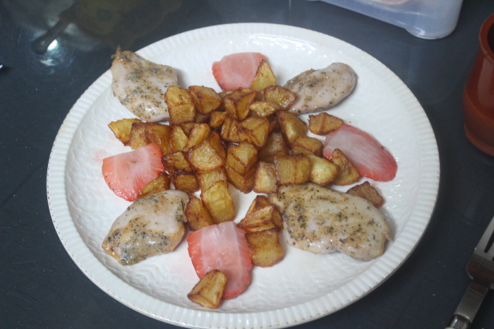 Servimos 4 pechugas, 4 mitades de fresas y la mitad de las patatas fritas en cada plato.