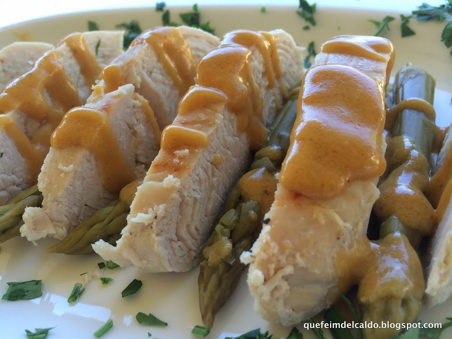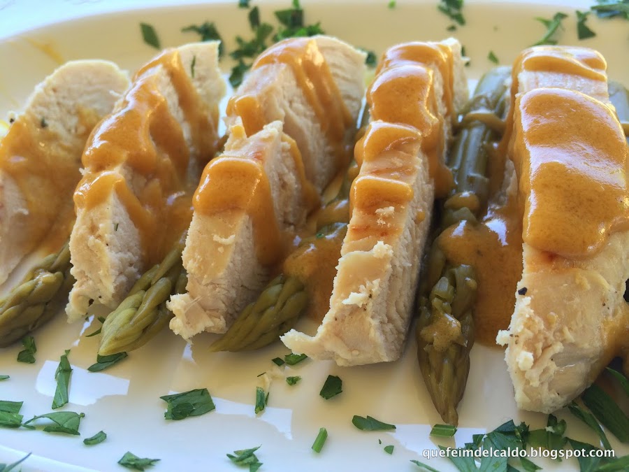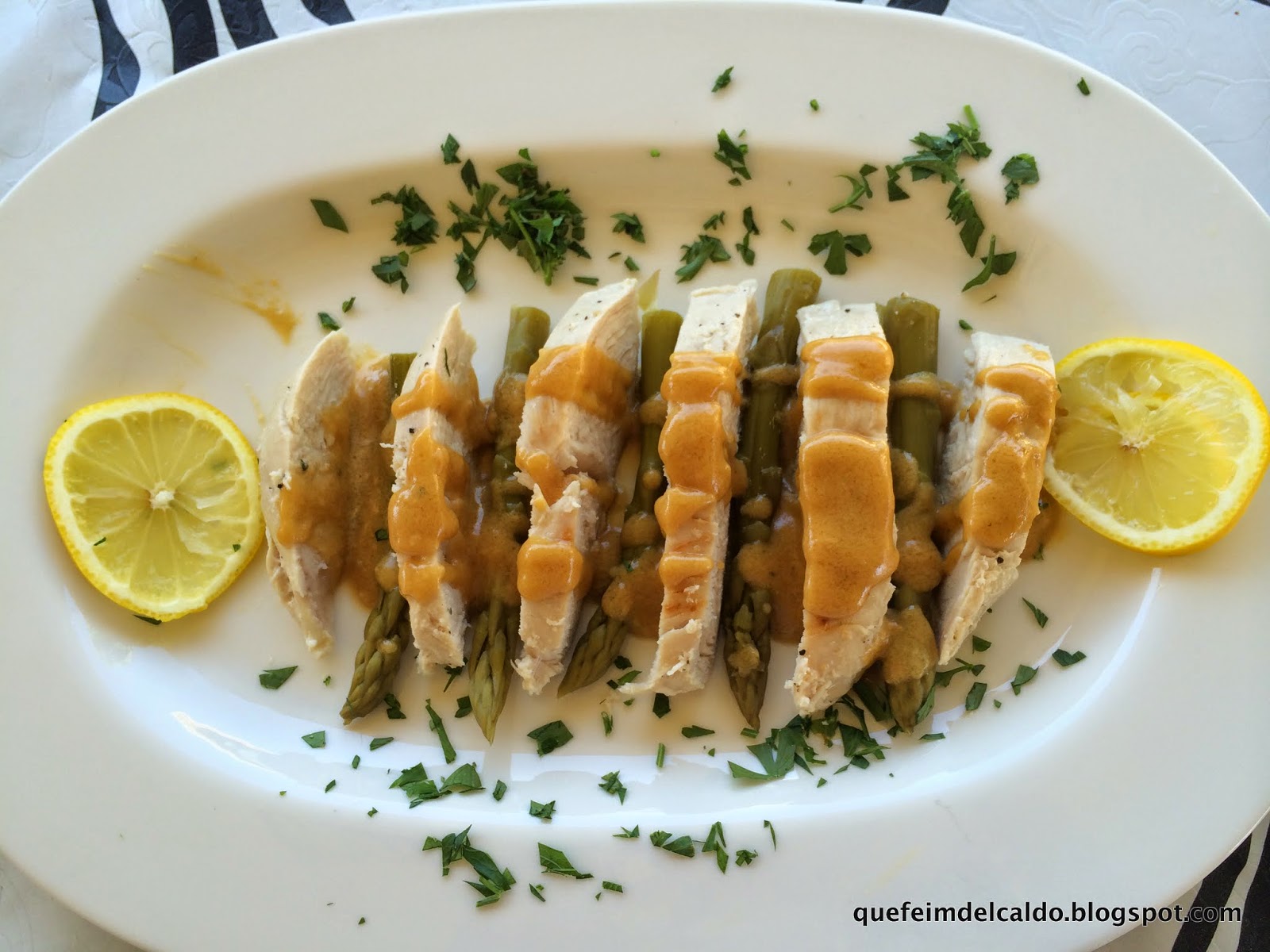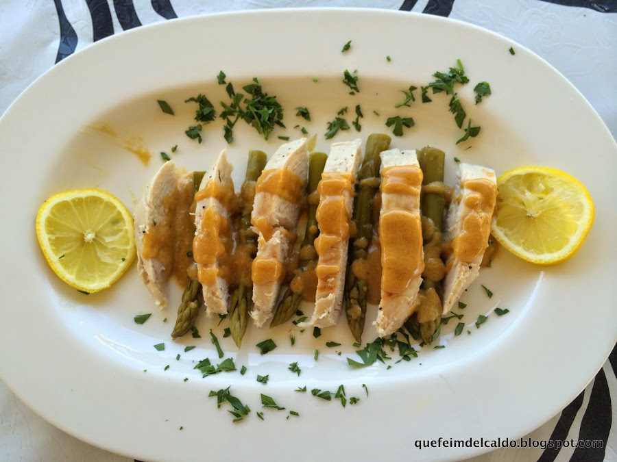 Emplatamos cortando la pechuga en trozos y en medio de cada trozo de pechuga ponemos una punta de espárrago verde, sobre la peghuca ponemos unas cucharadas de nuestra salsa de nata (crema de leche).