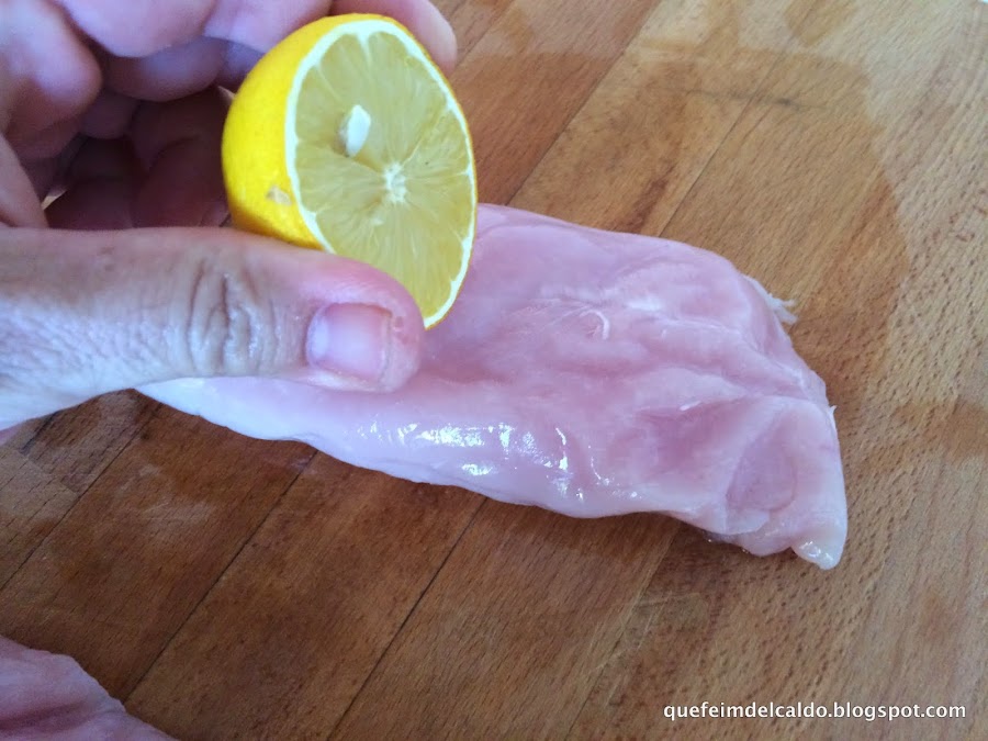 En primer lugar ponemos unas gotitas a las pechugas y les hacemos un pequeño masaje para distribuir las gotas del limón por las pechugas.