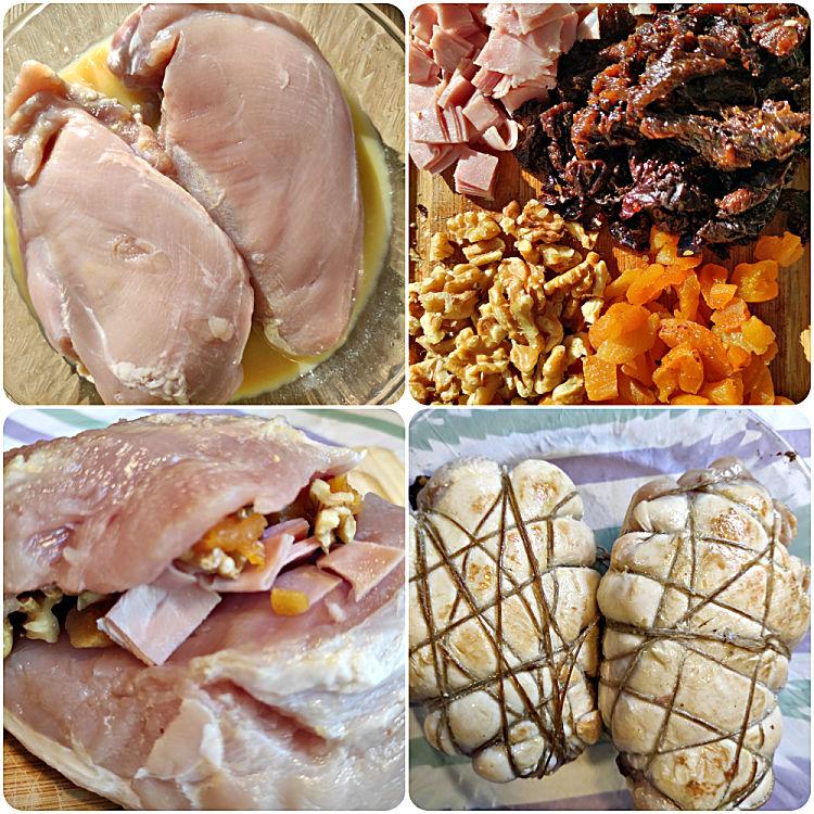 Para comenzar a hacer esta deliciosa receta de navidad, primero debemos exprimir las naranjas y ponemos a macerar las pechugas salpimentadas por al menos 2 horas, si las dejas en la nevera macerando desde la noche anterior, mucho mejor, así cuando la ases te quedarán mas tiernas y suaves.Corta las ciruelas y los orejones en trozos pequeños, el jamón de york en cuadritos y pica las nueces en trocitos, une todo en una especie de masa.