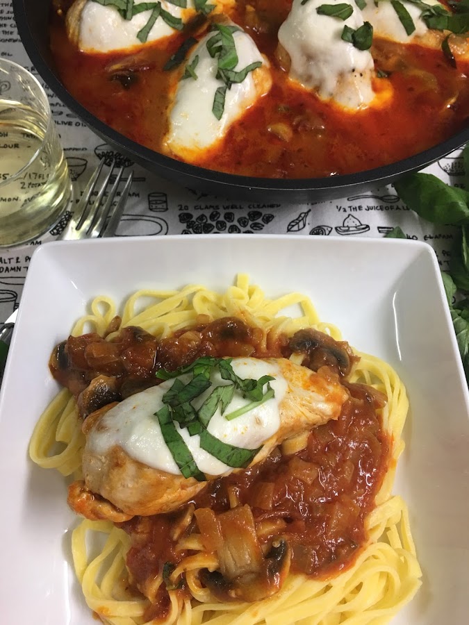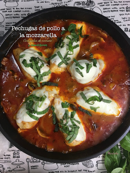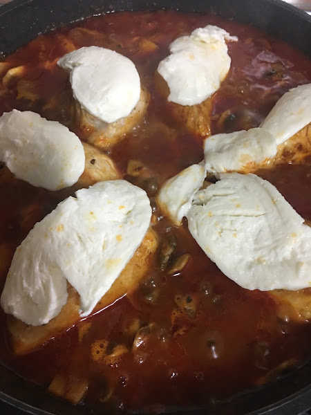 Por último, se añaden las pechugas de pollo y se cubren con una loncha de queso mozzarella. Se tapa con una tapadera la cazuela o sartén y se deja que se funda el queso con el calor.