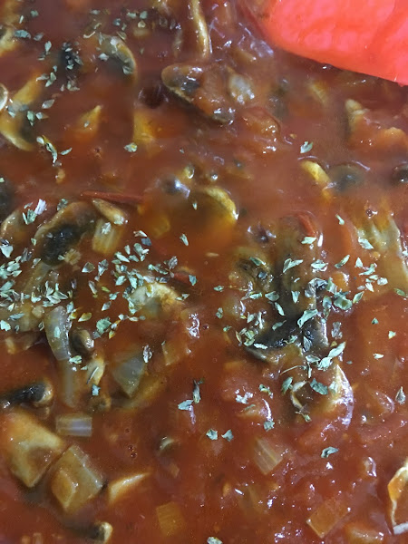 Cuando está blandita la cebolla se incorpora la salsa de tomate, se rectifica de sal y pimienta y se espolvorea con orégano.