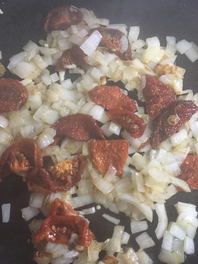 Se retiran del fuego y se reservan. En la misma sartén se añade un poco más de aceite y se pocha en él la cebolla muy picada y el diente de ajo. Unos 6-7 minutos a fuego no muy alto será suficiente. También añadimos los tomates secos cortados a la mitad.