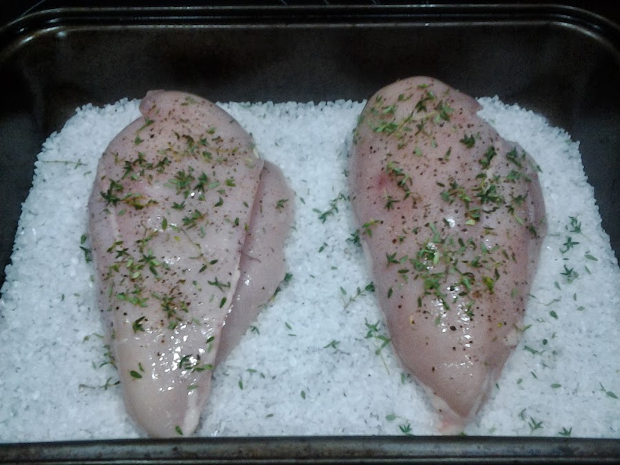 Cubrimos las pechugas con la sal y lo metemos al horno precalentado a 200º durante 30 minutos.