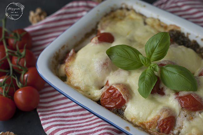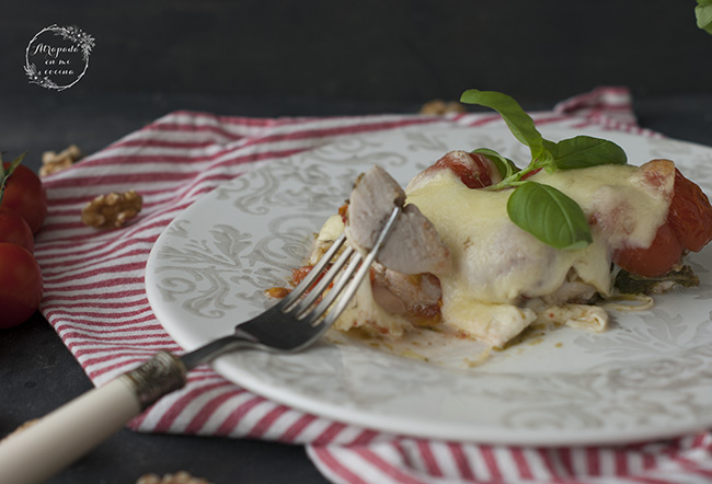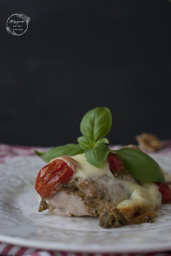 Hoy en el blog una de esas recetas sumamente sencillas y con un resultado espectacular. Unas pechugas de pollo, con salsa pesto, tomates cherry y queso mozzarella, ¿a qué suena bien?, pues la verdad es que saben igual que suenan. La idea la vi en Pinterest, como tantas otras recetas que me inspiran día a día. Se pueden preparar con antelación y meter en el horno en el último momento, lo que hace que sea una idea para tener en cuenta cuando tenemos prisa.