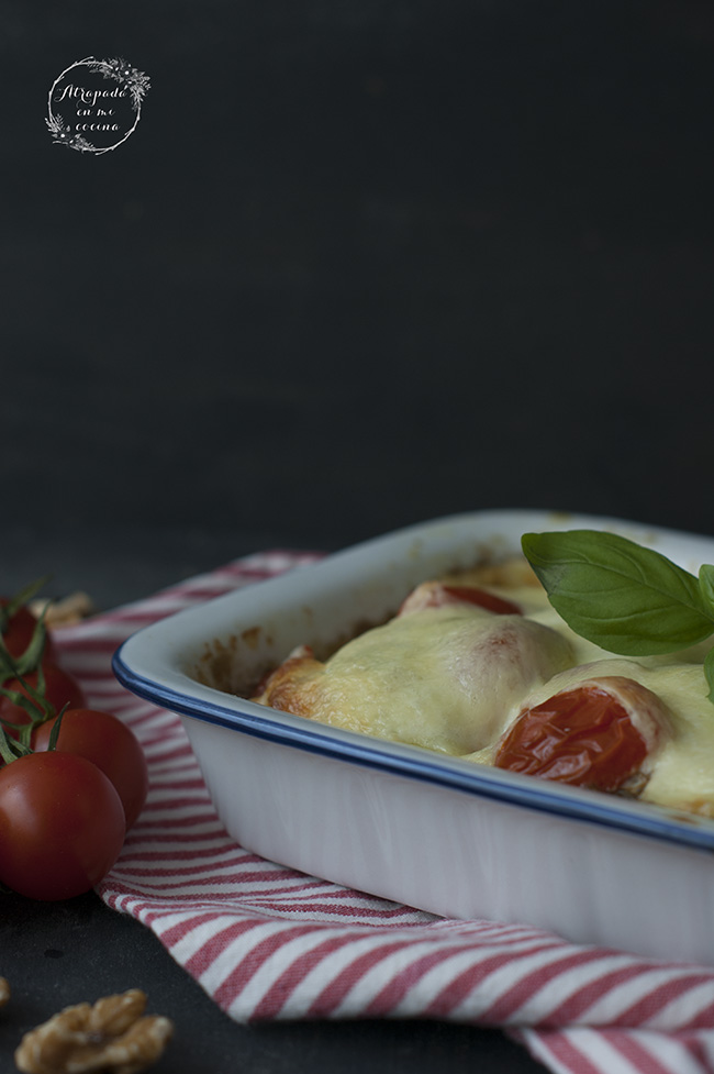 Horneamos durante unos 40 minutos en el horno, a 200º hasta que veamos que las pechugas estén hechas y los tomates también, así como el queso fundido. Sacamos y servimos.