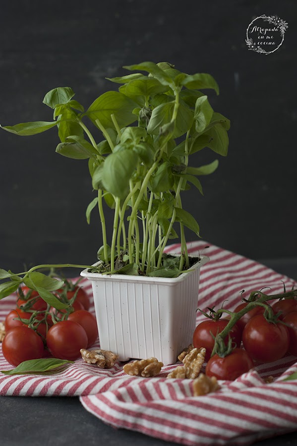 Lo primero que haremos será preparar la salsa pesto. Para ello ponemos en el vaso de la batidora el aceite, el diente de ajo, la albahaca y el puñado de nueces (he prescindido del queso porque ya lleva la receta y no quería añadir calorías extra, por lo que la salsa de pesto sale más ligera). Trituramos todo bien y reservamos.