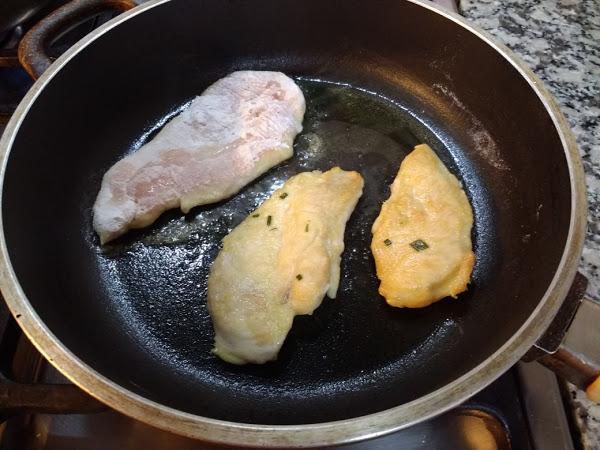 El primer paso es retirar la piel de las pechugas de pollo y salpimentarlas. Luego pasarlas por harina de ambos lados.Calentar una sartén a fuego medio y agregar la manteca y el aceite. Una vez que este bien caliente colocar las pechugas de pollo en la sartén y cocinarlas hasta que estén doradas de los dos lados y cocidas por dentro.