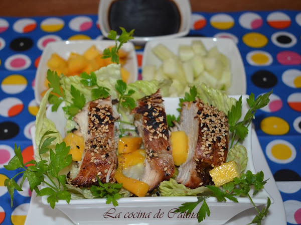 Cortamos las pechugas en láminas gruesas y servimos en una cama de ensalada mezclada con mango, pepino y la vinagreta aparte.