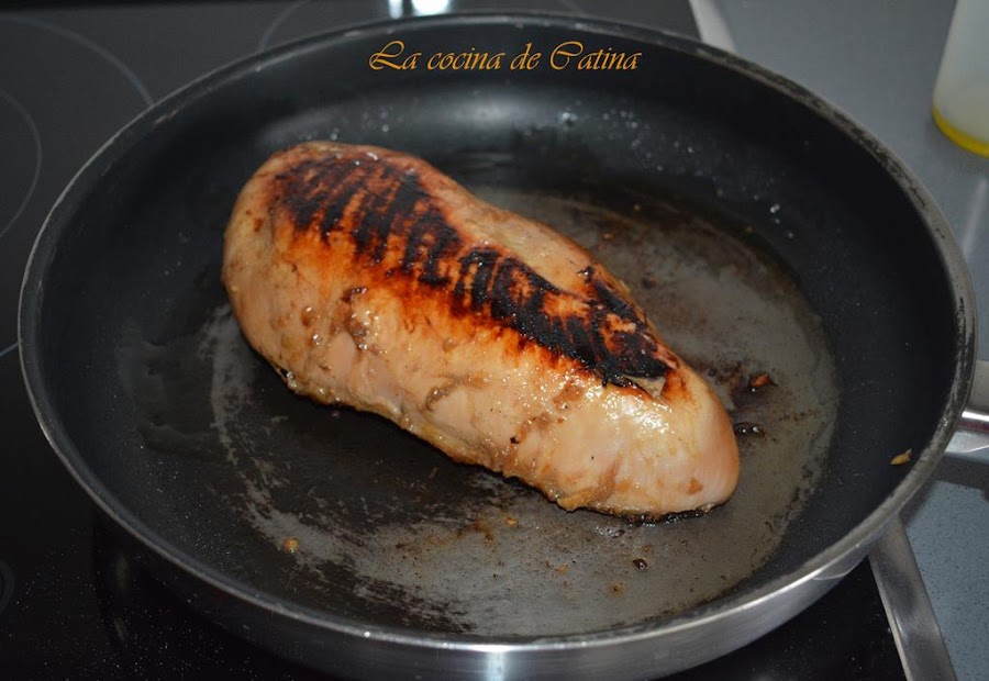 Ponemos a calentar una sartén antiadherente a fuego alto con una cucharada de aceite y doramos las pechugas un minuto por cada lado.