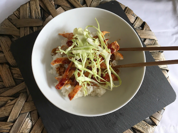 Cuando ya está terminado el arroz, ponemos un poco de salsa teriyaki en la sartén o plancha donde estemos haciendo el pollo, se puede pincelar cada filete de pechuga o echarlo en la misma sartén y darles unas vueltas para que queden bien impregnados con la salsa teriyaki.