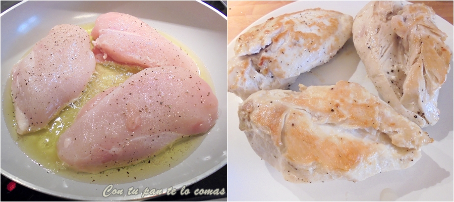 1. Dorar las pechugas (enteras) en una sartén con aceite de oliva, sazonadas con sal y pimenta negra. Retirar a un plato.