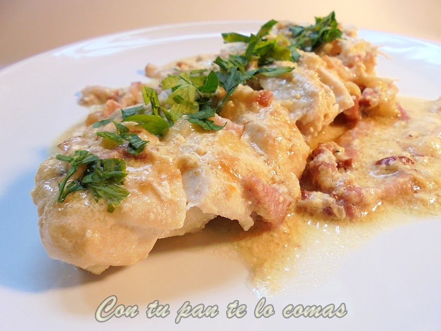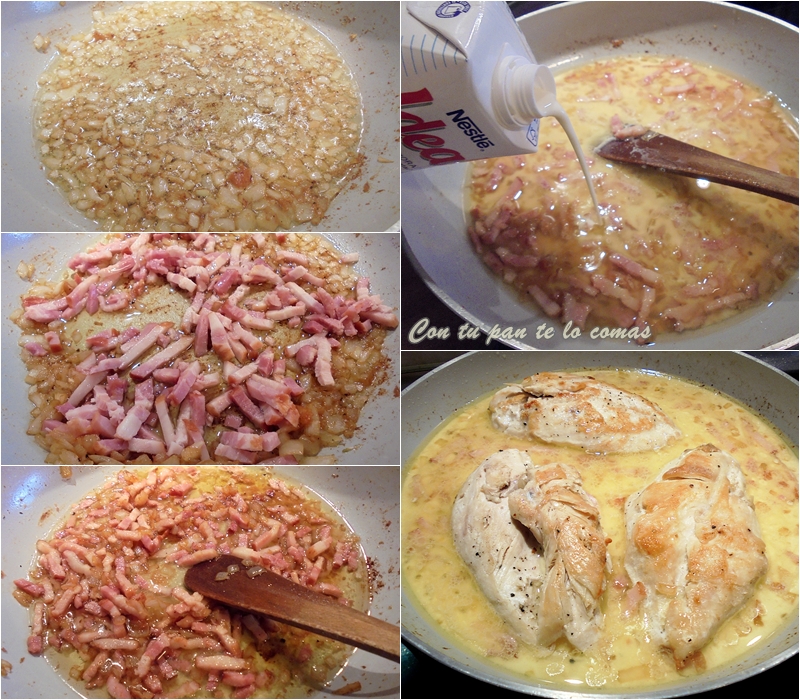 Bacon y nata (crema de leche), para mi gusto una de las mejores combinaciones con las que se puede hacer una salsa. Si habitualmente la utilizamos para pasta (la carbonara a la española), hay que ver lo bien que le va a las carnes, sobre todo el cerdo y el pollo.