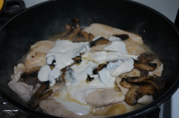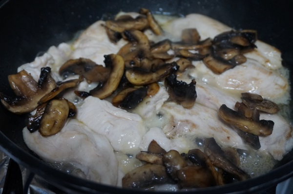 Cuando estén doradas las pechugas añadimos los champiñones, removemos, añadimos el vino blanco, lo dejamos reducir un par de minutos.