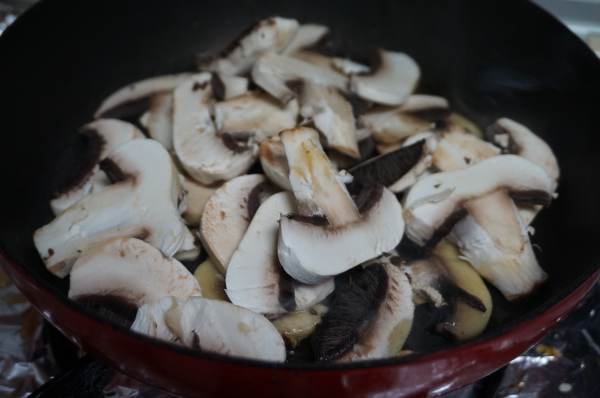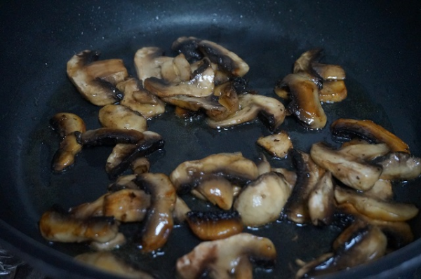 Salteamos los champiñones en una sartén con un poquito de aceite. Sacamos y reservamos.