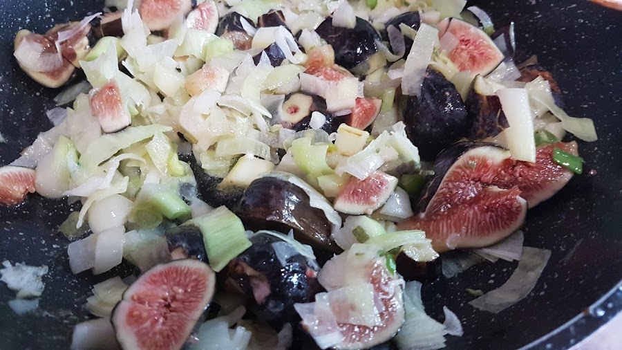 4.- Añadimos una pizca de sal, las hojas de savia y cocinamos unos minutos. Lavamos los higos, los cortamos en trozos y se los añadimos al sofritos, cocinamos 2 minutos más. Vertemos el vino y lo dejamos reducir. Añadimos la soja, el vinagre y el chocolate. Cocinamos la salsa 5 minutos más, aplastamos los higos con un tenedor. Incorporamos la pechugas a la salsa y cocinamos a fuego medio 15 minutos hasta que estén bien hechas por dentro.