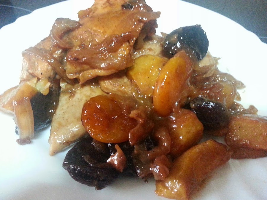 Desde Recetas de casa os traemos una receta que nos ha dado esta semana una amiga de nuestro Grupo de Facebook RECETAS DE CASA y que hemos ejecutado hoy mismo. Se trata de pechugas de pollo al moscatel (vino dulce) con ciruelas pasas y orejones de albaricoque. Un extraordinario contraste de sabores.