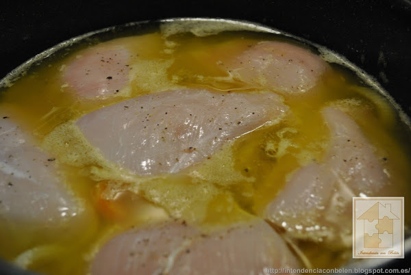 Incorporamos las pechugas y lo mantenemos al fuego durante unos 30 minutos, con la tapadera puesta.