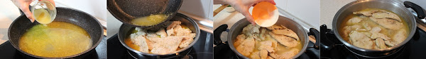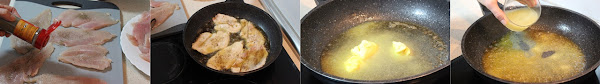 En el aceite sobrante (si es mucho, retiramos un poco) ponemos la mantequilla, cuando se haya derretido, añadimos el zumo de limón y el caldo de carne, dejamos que comience a hervir y se lo añadimos a las pechugas.