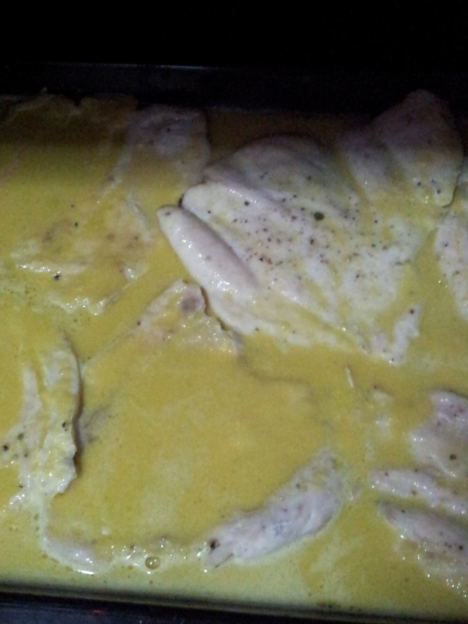 Adobar el pollo con la sal, pimienta y la pastilla de caldo, untar con un chorrito de aceite de oliva la bandeja del horno, depositar los filetes de pollo y lo introducimos en el horno a 170º C durante 10 minutos, dándole la vuelta.