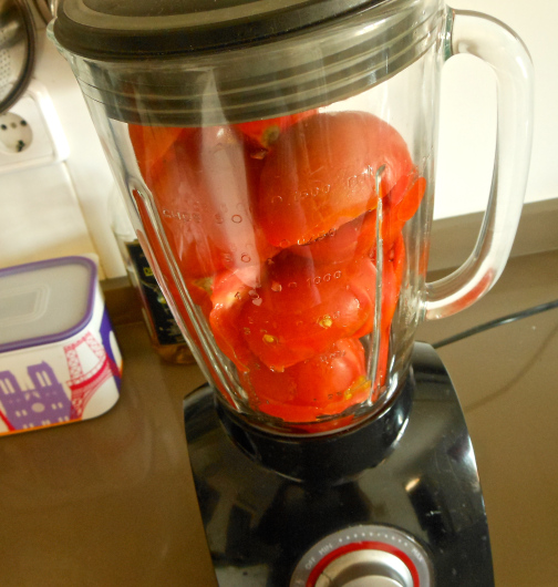 Mientras tanto lava bajo el chorro del agua fría del grifo los tomates y después tritúralos con tu batidora eléctrica.