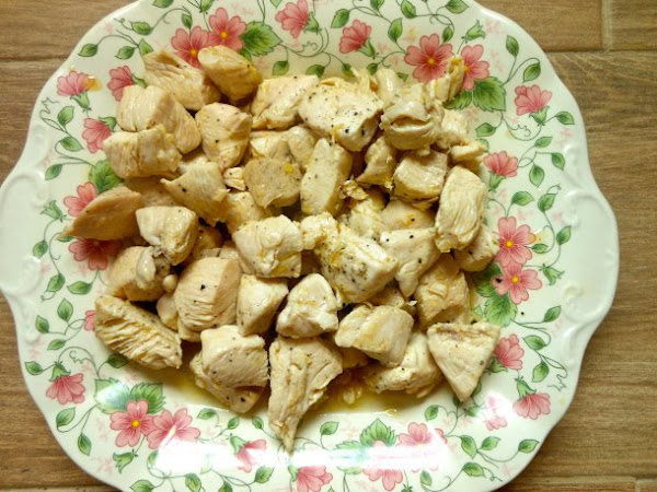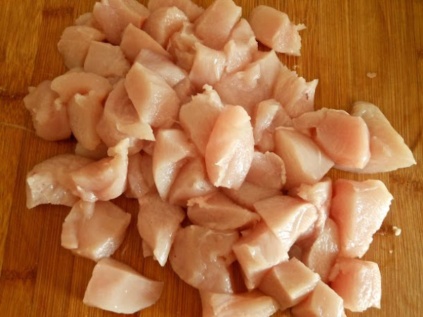 Después trocea las pechugas de pollo en cubos de tamaño regular y condiméntalas con pimienta negra molida. No las sazones.
