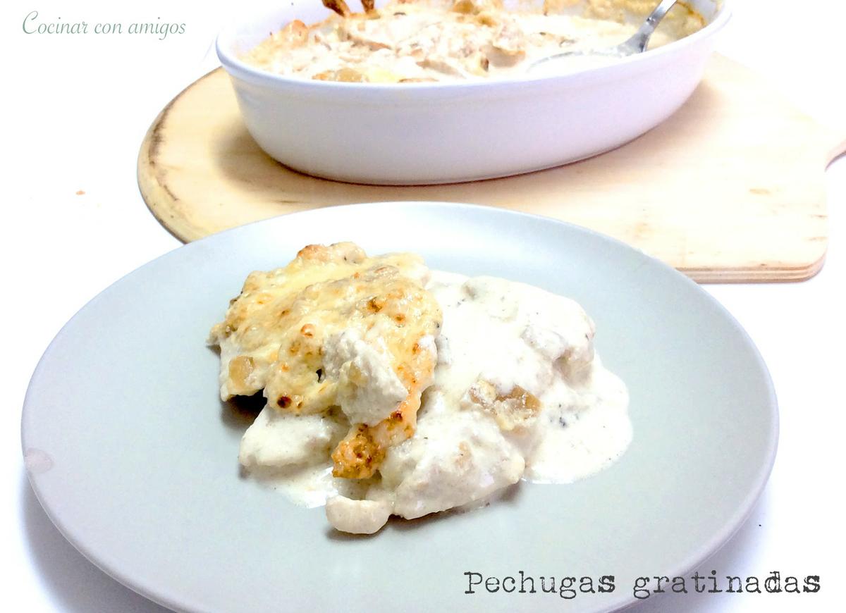 Es una receta sencilla que se puede dejar preparada con antelación y gratinarla justo antes de comer, nosotros la solemos hacer los jueves para comerla los viernes. Probad las pechugas de pollo gratinadas y me contáis que os parecen!