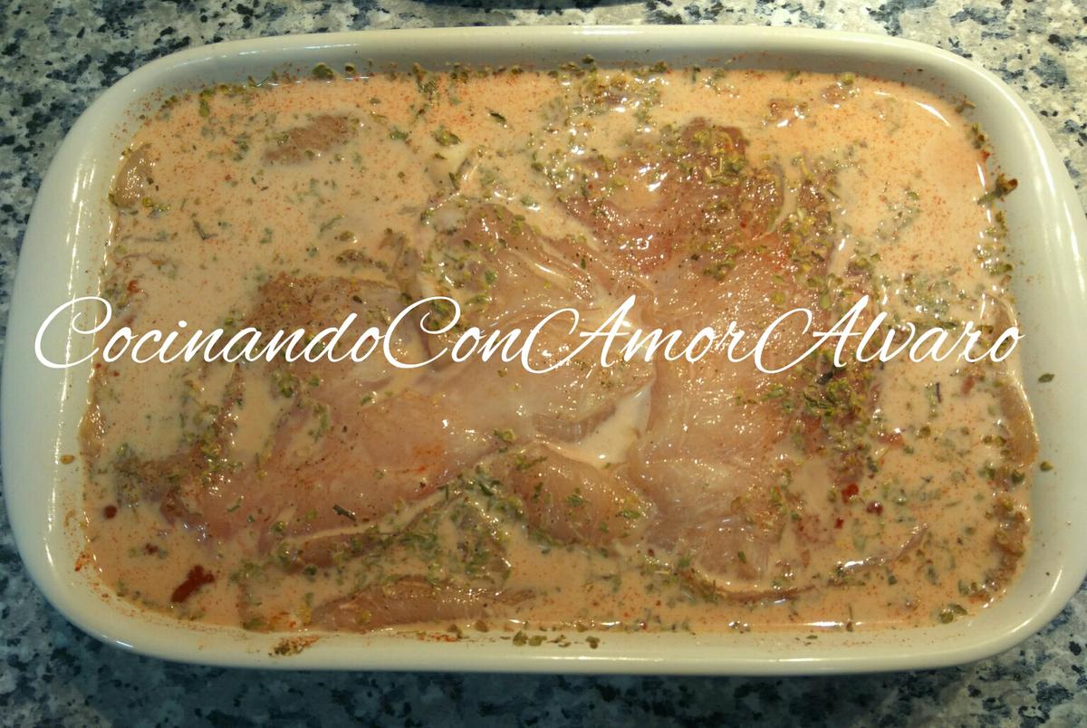 Ponemos las pechugas de pollo en una fuente, agregamos el orégano, un poco de pimentón dulce, la sal, pimienta negra molida, y la leche hasta que cubra. Movemos la mezcla, y tapamos con papel film, e introducimos al frigorífico 30 minutos.