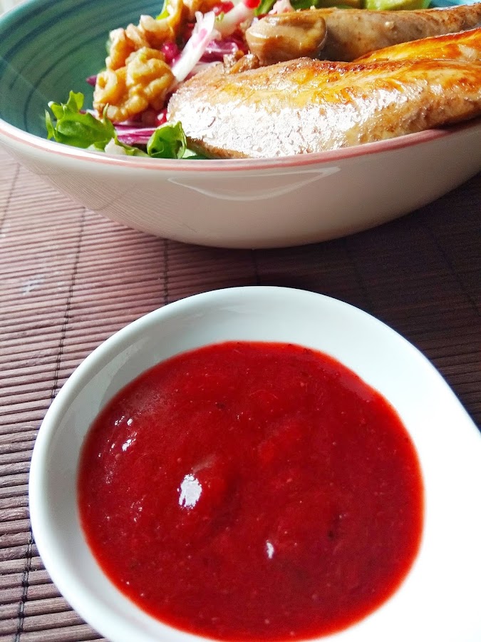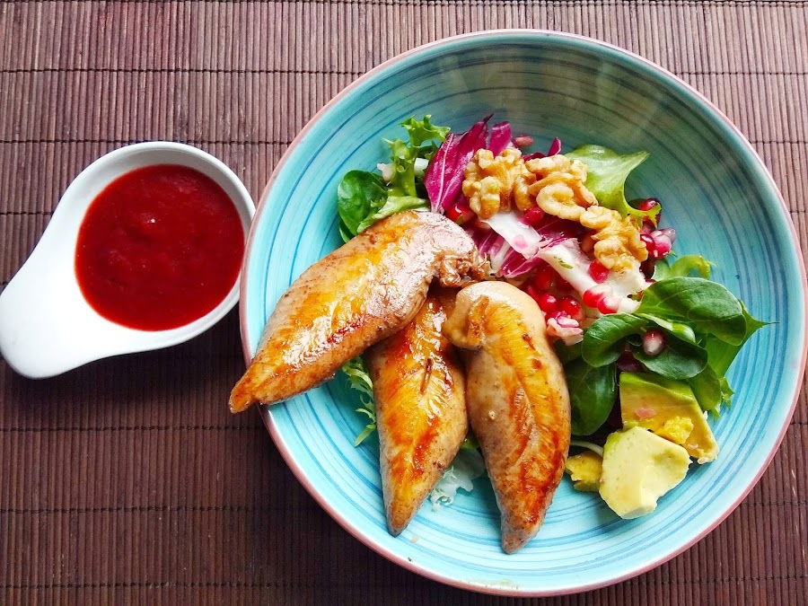 Cuando estén hechas las pechugas, sacamos, emplatamos, acompañamos de una buena ensalada (la mía es ensalada variada, con aguacate, granada y nueces) y servimos con la salsa de fresas aparte para que se echen cuanto quieran.
