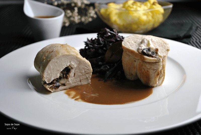 En mi caso las he rellenado con queso crema y arándanos y acompañadas de una rica col lombarda, que le da color al plato debido a su morado, y unas patatas gratinadas hechas de una forma sencilla.